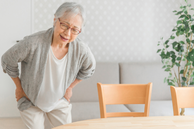 股関節を動かすと痛むため、上体を前に傾けて歩くようになります。これにより、腰や膝にも負担がかかります。