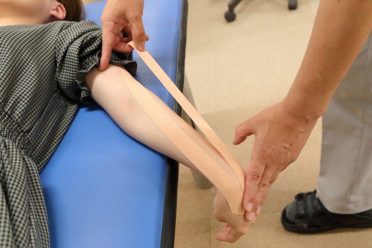 関節や筋肉をサポートしながら動作を補助することで、スポーツ時のパフォーマンス維持やケガの再発防止に役立ちます。また、患者様がご自身で正しくテーピングを行えるよう、理学療法士が丁寧に指導いたします。